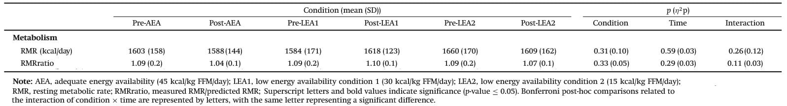 In Bezug auf den Stoffwechsel konnten keinerlei signifikante Veränderungen bei allen Gruppen festgestellt werden – und zwar weder beim Ruhe-Energieverbrauch (RMR), noch der RMRratio (einer Größe, die zur Bewertung der Energieverfügbarkeit in Sportlern herangezogen wird (30)).
