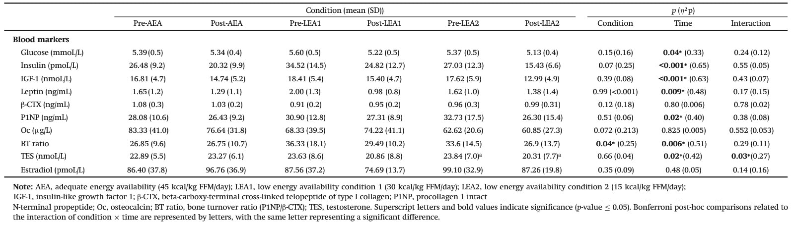 Die Forscher vermuten, dass die zugeführte Menge an Tageskalorien während der LEA1-Intervention (basierend auf dem Ruhe-Energieverbrauch) vermutlich noch ausreichend hoch gewesen ist, um ein Energiegleichgewicht zu halten, wodurch physiologische Beeinträchtigungen vermieden werden konnten, auch wenn in beiden LEA-Gruppen – verglichen zur AEA-Intervention – eine signifikante Reduktion des Körpergewichts und des Body Mass Index (BMI) festgestellt werden konnte. Das Wissenschaftlerteam sieht diese Erkenntnisse als einen wichtigen Schritt zur Identifikation von Biomarkern an, die zur Früherkennung von LEA-Symptomen bei männlichen Sportlern eingesetzt werden könnten.