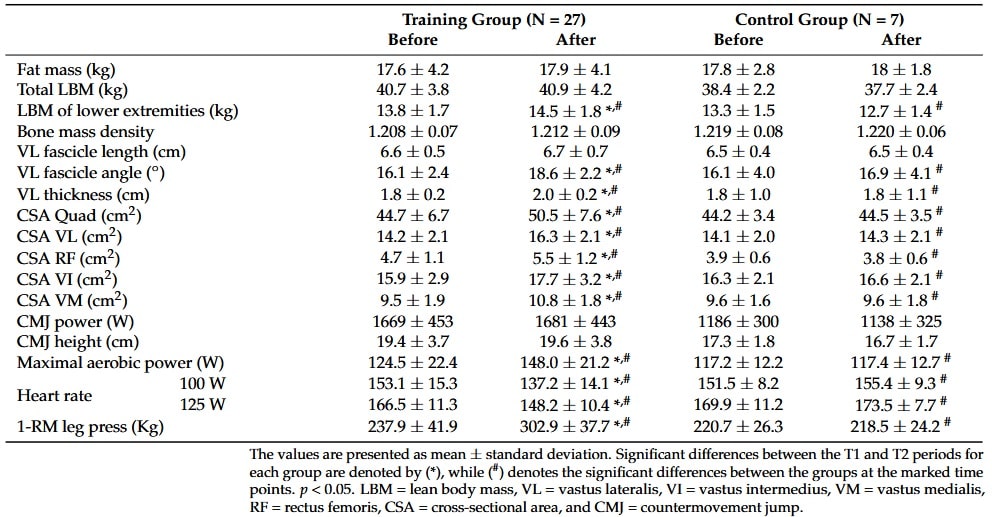 Veränderung der Körperzusammensetzung, der Muskelarchitektur des Vastus lateralis, der Muskelquerschnittsfläche des Quadrizeps und Trainingsperformance vor (Before) sowie nach (After) dem initialen 12-wöchigen Training (T1 – T2). Zum Vergrößern, bitte hier  klicken. (Bildquelle: Mpampoulis et al., 2024)