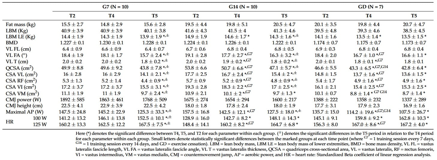 Die nachfolgende Tabelle liefert eine Übersicht zu allen evaluierten Parametern (darunter Körperkomposition, Performance und Knochenmineraldichte) vor und nach der Reduktion der Trainingsfrequenz bzw. Detraining: